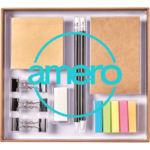 The Multi-Desktop Set includes 1-piece mechanical pencil, 1-piece ballpoint pen, 1-piece eraser, 1-piece color matching notepad and sticker, and small sticky flag in 5 colors. Please note due to the material that the cover may bend and not be flush to box.
