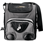 Great for the beach and other outdoor events. Zippered leak-proof main compartment holds up to 20 cans. Features water-resistant speakers. Uses 3.5mm port. Zippered electronics pocket in front includes headphone port. Uses four AA batteries (not included). Adjustable shoulder strap. Insulated PEVA lining.